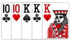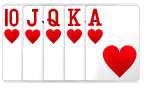 ROYAL FLUSH : kombinasi kartu ini adalah tingkatan tertinggi dalam permainan Poker, angka pada kartu harus berurut dengan angka tinggi, yaitu 10 ♠ - J ♠ - Q ♠ - K ♠ - As ♠ dengan bunga yang sama (tidak boleh beda), contoh lain : 10 ♥ - J ♥ - Q ♥ - K ♥ – As ♥