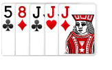THREE OF KIND : Kombinasi kartu ini hampir sama dengan FOUR OF KIND, bedanya THREE OF KIND hanya membutuhkan 3 angka kartu yang sama. Misal : As♦ - As♥ - As ♠ - 8 ♣ - 10 ♣ atau 8 ♣ - 8♦ - 8♥ - 4 ♠ - 1♦